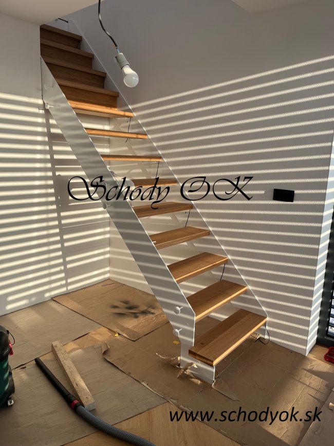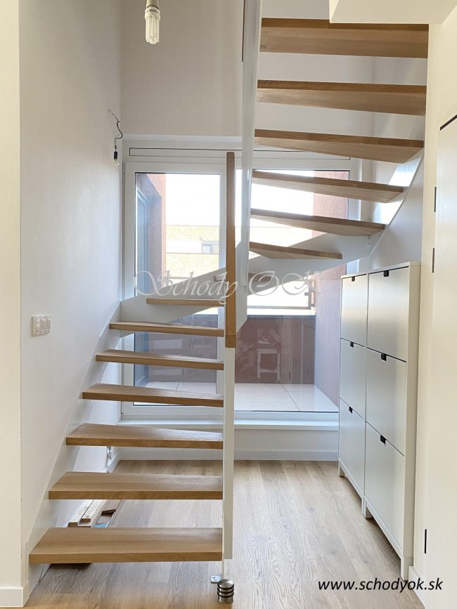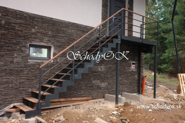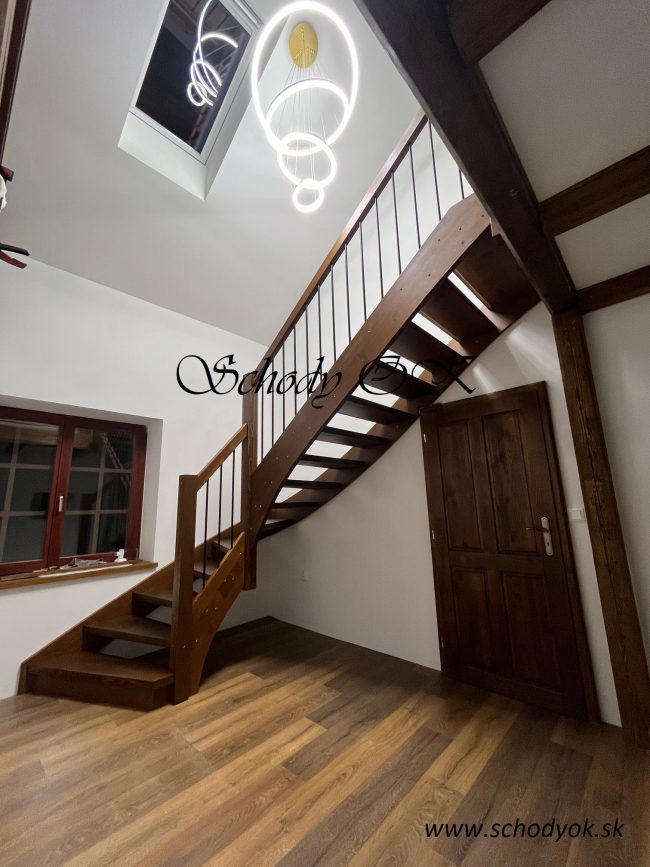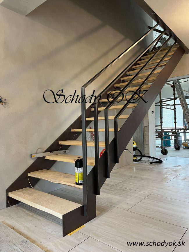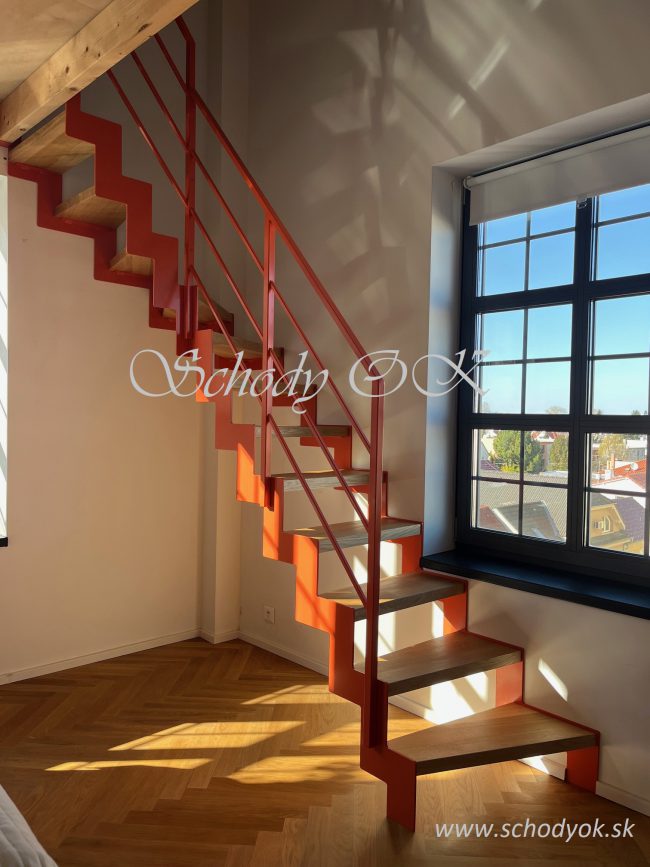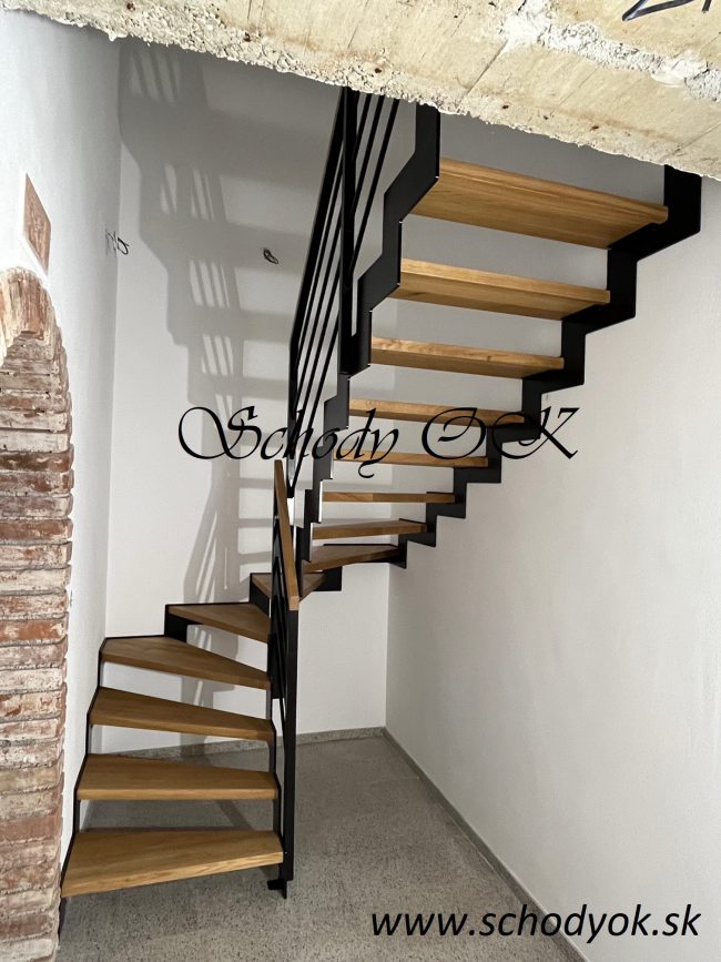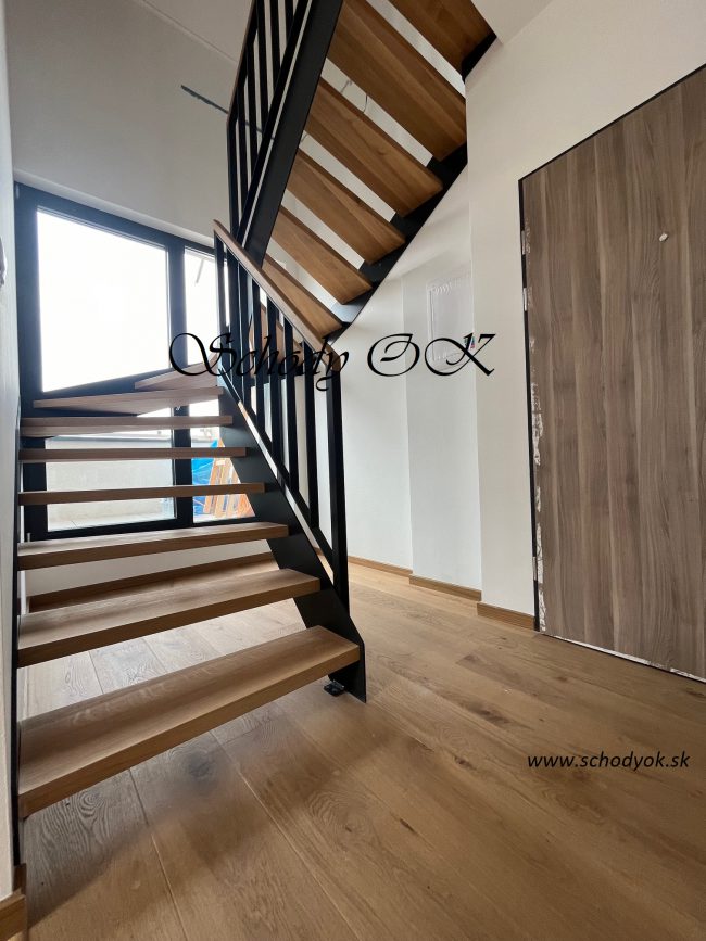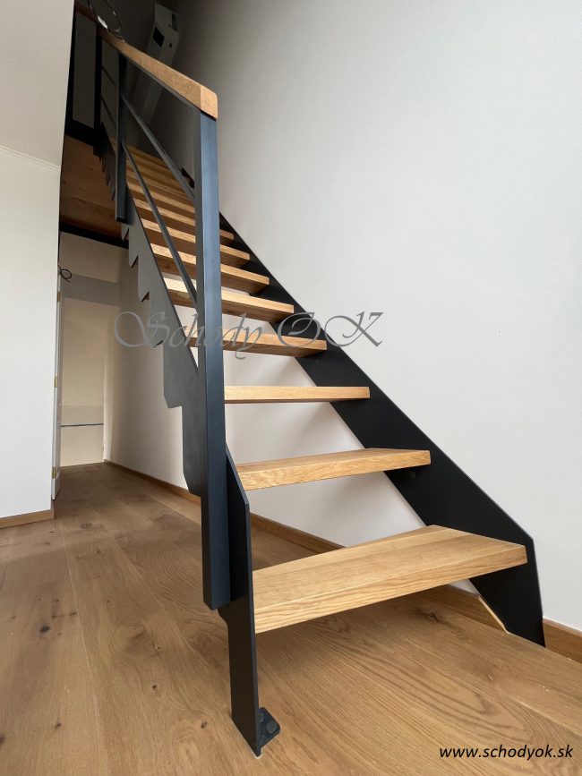 Schodisko s požiadavkou na čo najväčšiu priechodnosť pod schodiskom – konštrukcia schodiska a zábradlie je  oceľové s povrchovou úpravou striekaním práškovou farbou RAL 7016, stupne a madlá sú z materiálu Dub, povrchová úprava tvrdovoskovým olejom Osmo.
